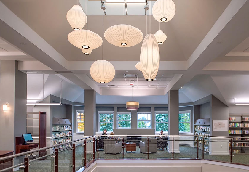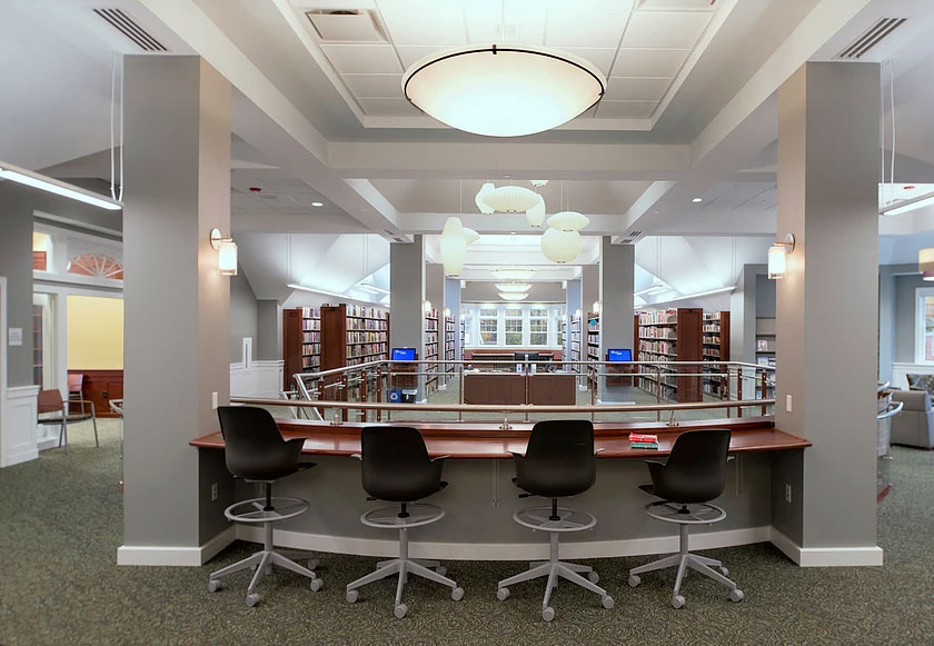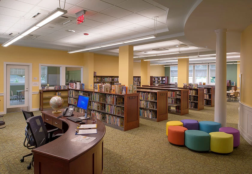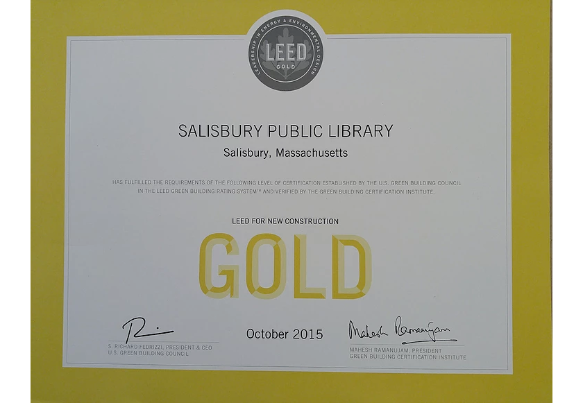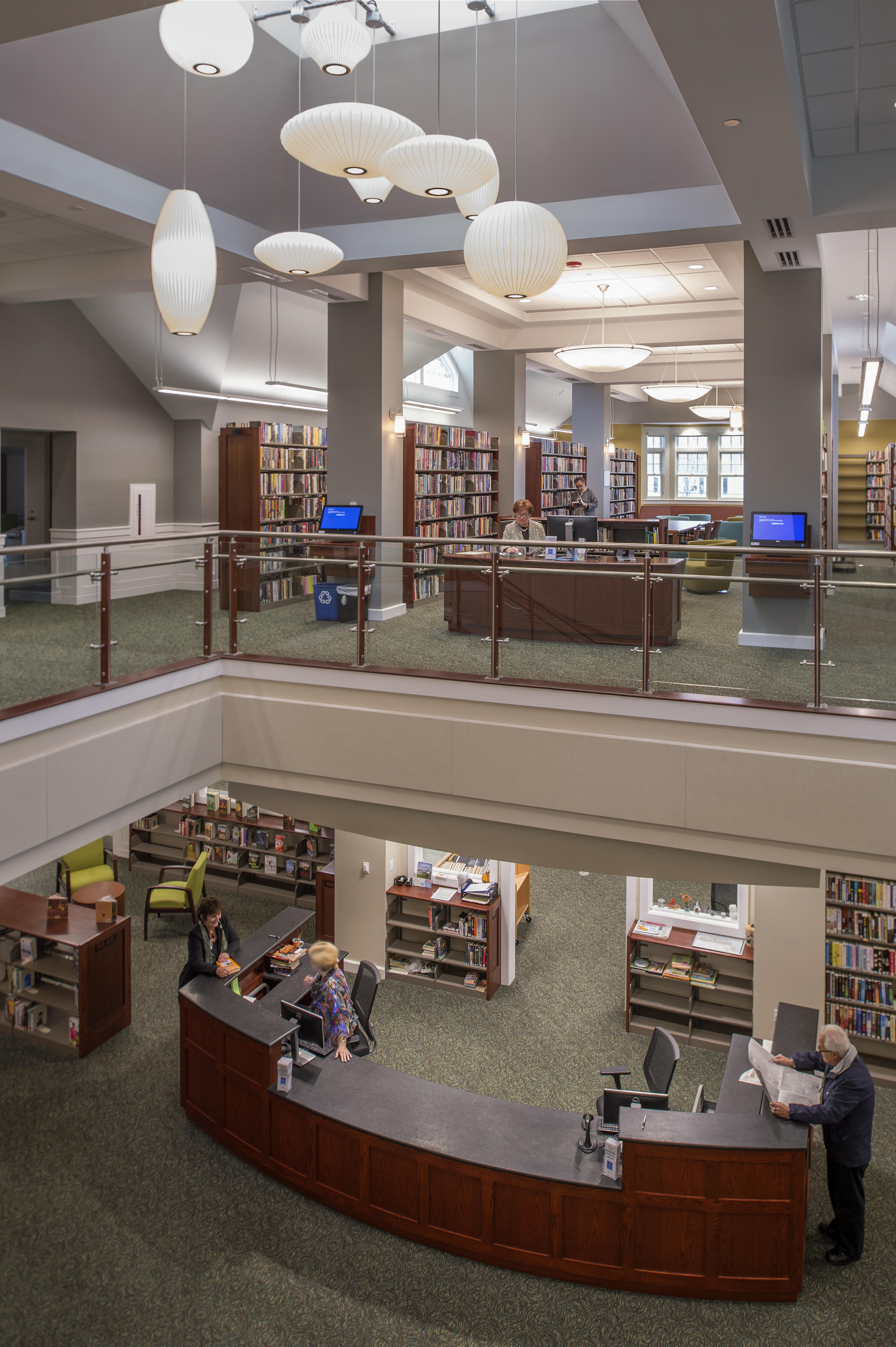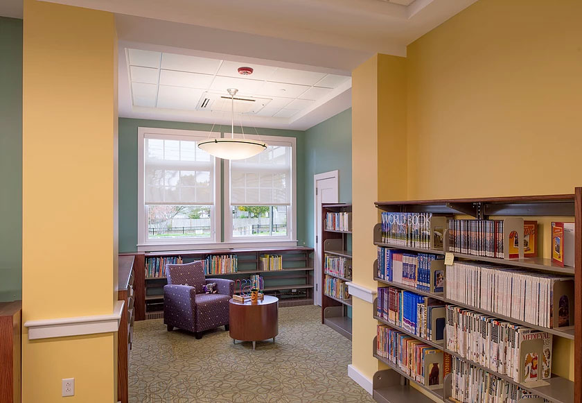 The two-story building in the "shingle style," has a footprint of 10,000 square-feet on the first floor, with its open center atrium and graceful half-circle staircase leading to the 6,027 square feet on the second floor. This building has front desk, a 100 person community meeting room, achieve room, windowed study rooms, computer room, children's library suite, kitchen, restrooms. The building's electric lighting has dimming capabilities allowing them to be lowered when nature provides ample illumination, saving energy. Abundance of windows in the design provides natural light as well as architectural interest. This new construction project is LEED Gold certified.