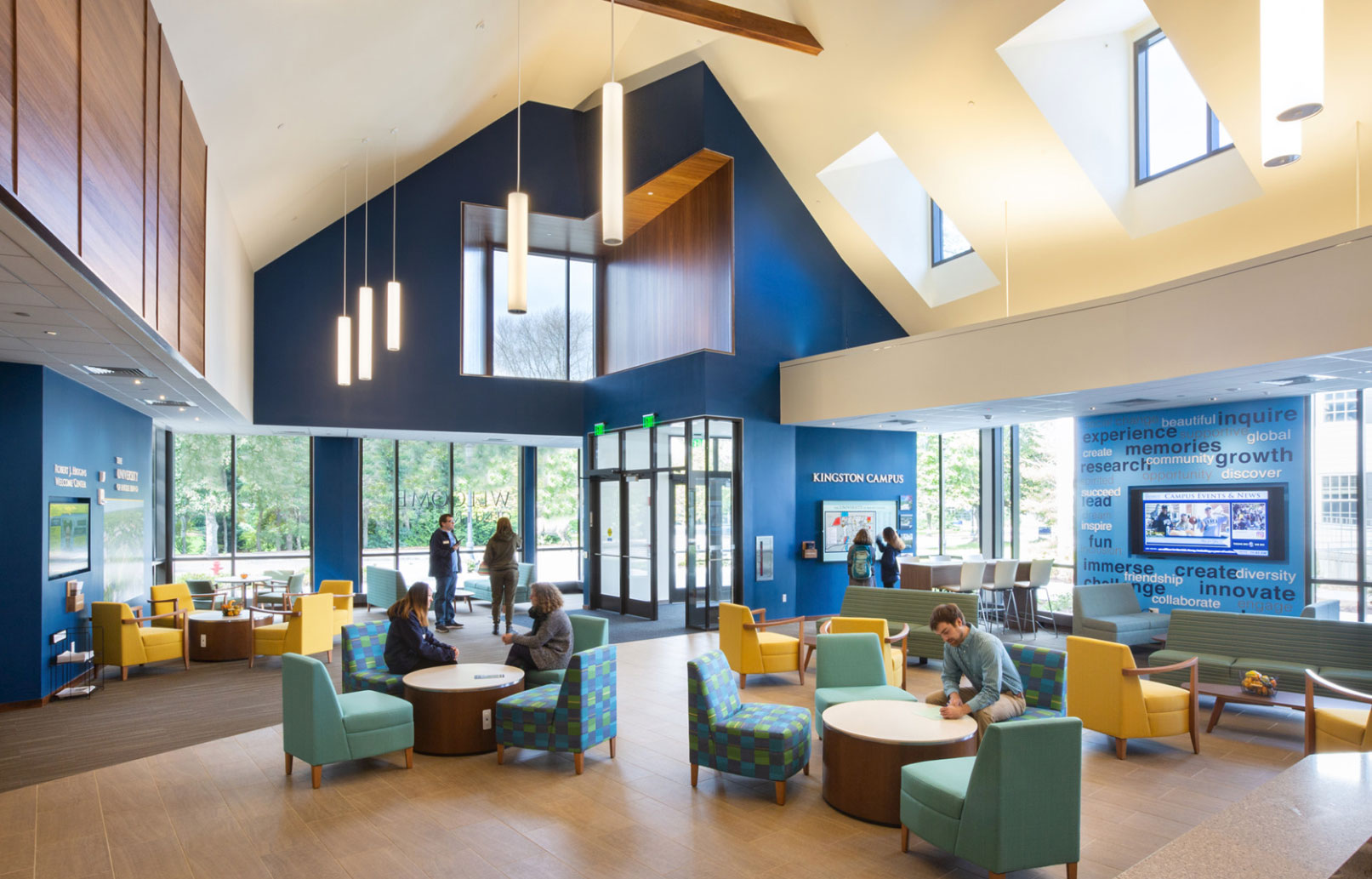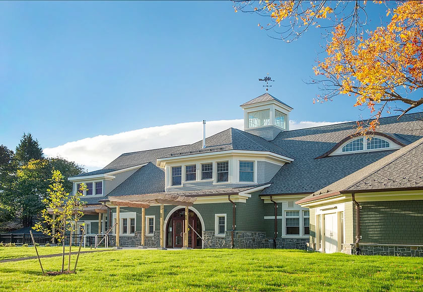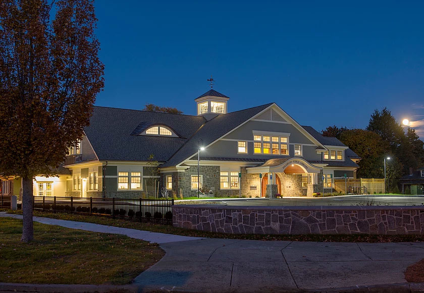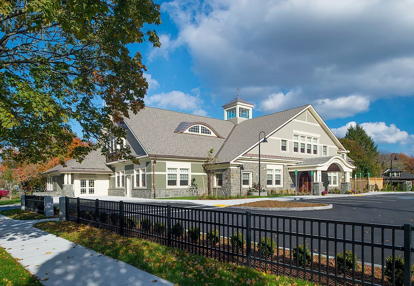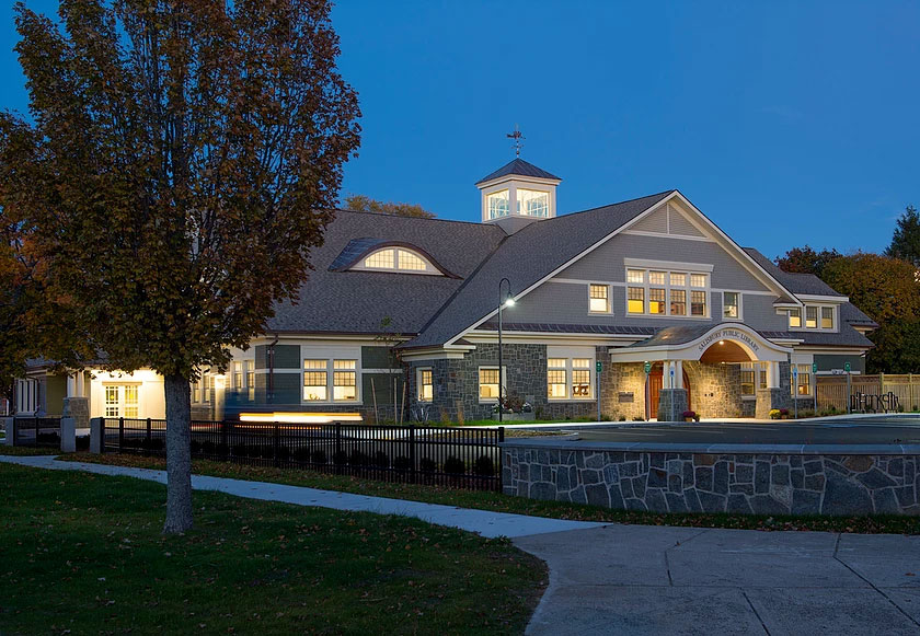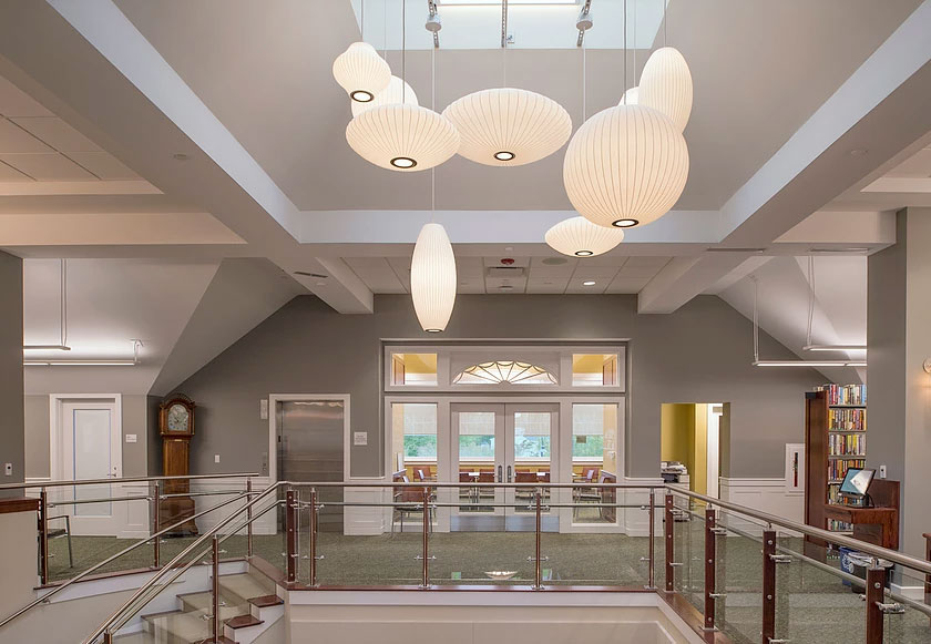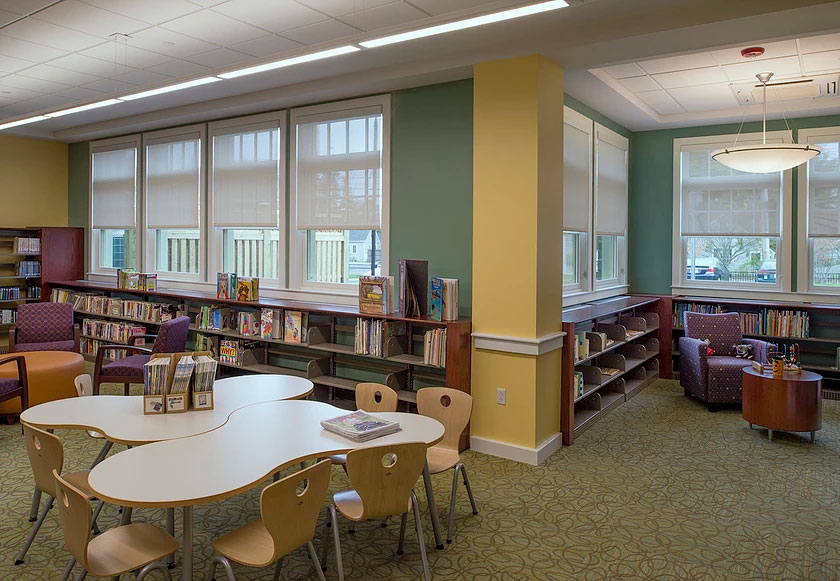 The two-story building in the "shingle style," has a footprint of 10,000 square-feet on the first floor, with its open center atrium and graceful half-circle staircase leading to the 6,027 square feet on the second floor. This building has front desk, a 100 person community meeting room, achieve room, windowed study rooms, computer room, children's library suite, kitchen, restrooms. The building's electric lighting has dimming capabilities allowing them to be lowered when nature provides ample illumination, saving energy. Abundance of windows in the design provides natural light as well as architectural interest. This new construction project is LEED Gold certified.
